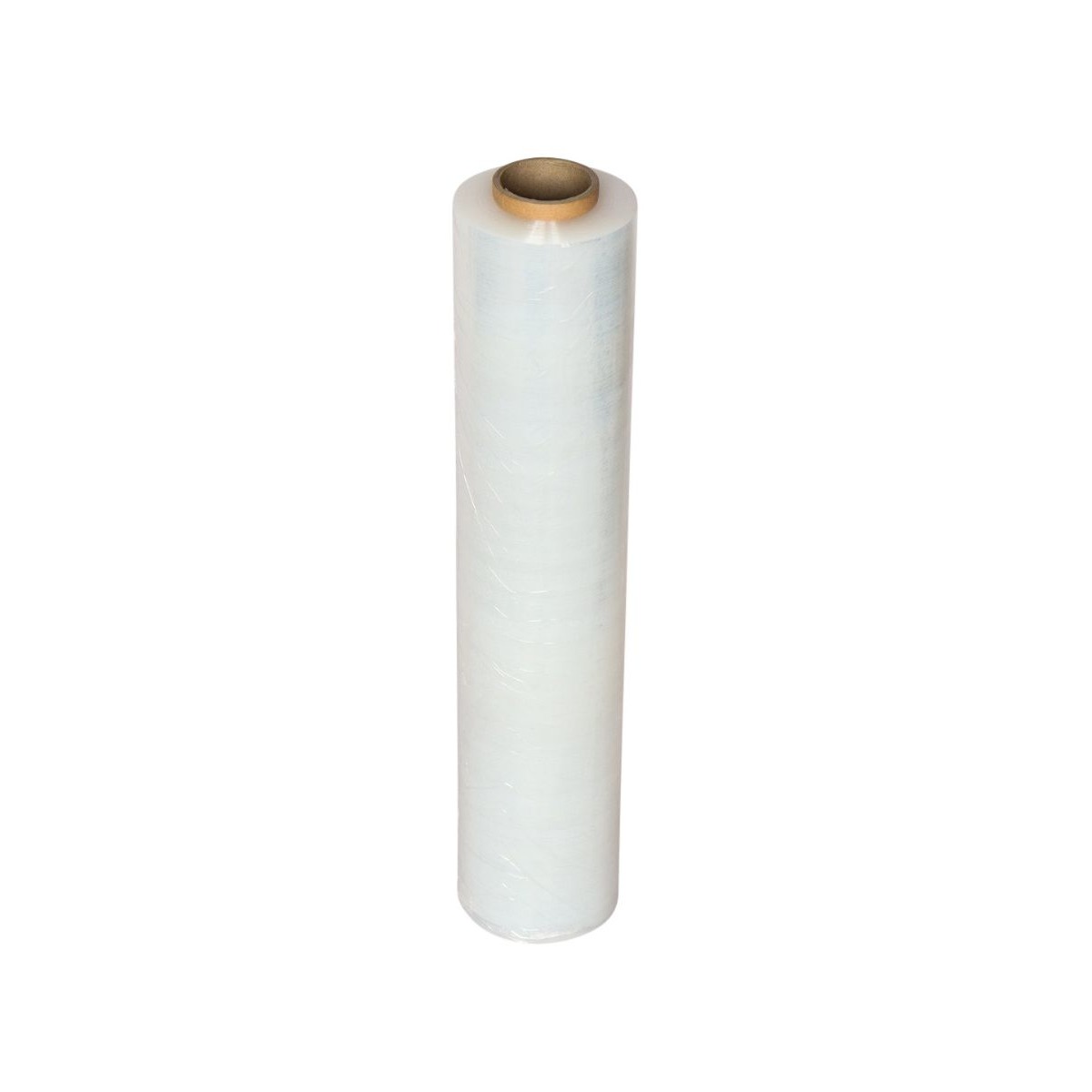 Durable hand stretch film designed for securely wrapping and stabilizing loads. Pre-stretched for easy use, it requires less effort and tension to apply, making manual wrapping quicker and more efficient.